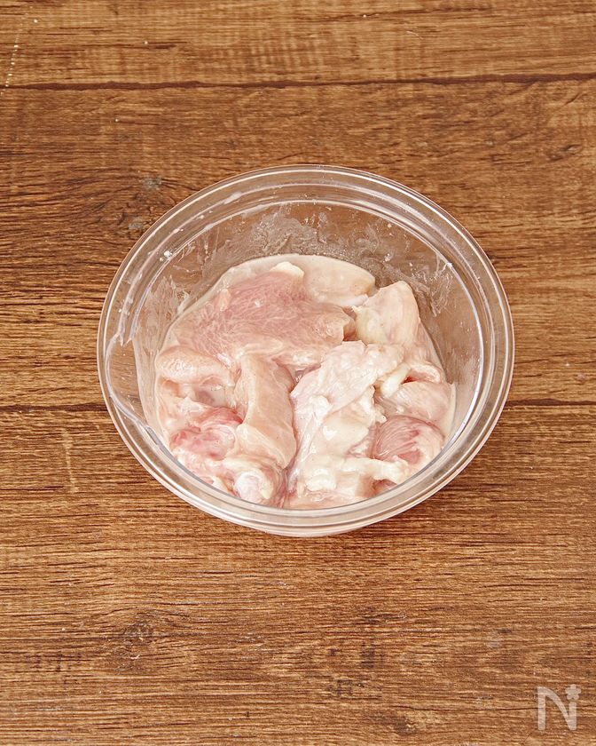(2) ボウルに鶏むね肉を入れ、【A】を加えて揉み込んだら、片栗粉を加えて馴染ませる。