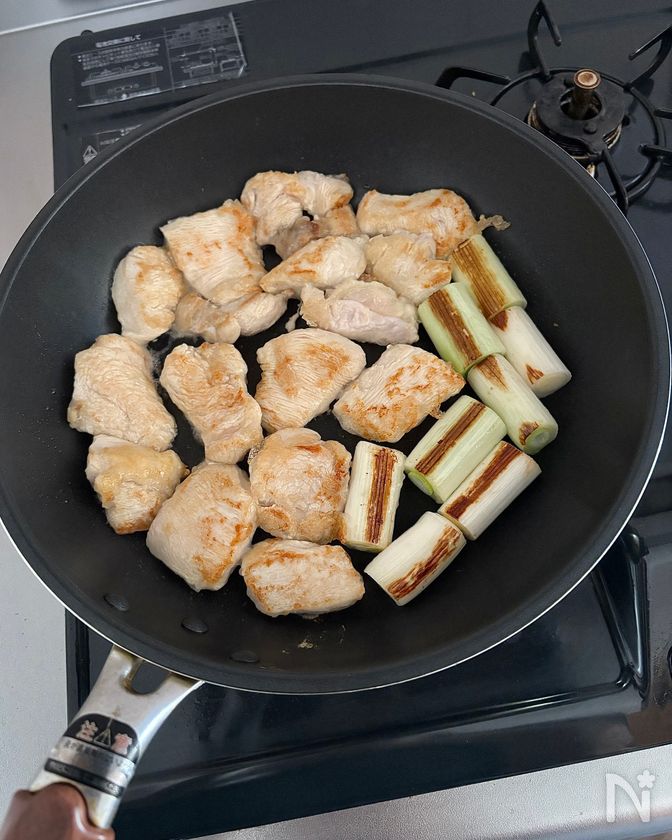 (3) フライパンにサラダ油を中火で熱し、鶏むね肉、長ねぎを焼く。2分ほどしたら裏返し、さらに2分ほど焼く。(お好みで長ねぎに軽く塩こしょうを振っても良いです◎)