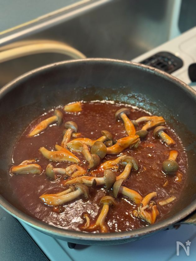(4) 最後に【デミきのこソース】作り。同じフライパンに【C】を煮立たせて、とろみがつくまで弱めの中火〜中火で煮詰める。