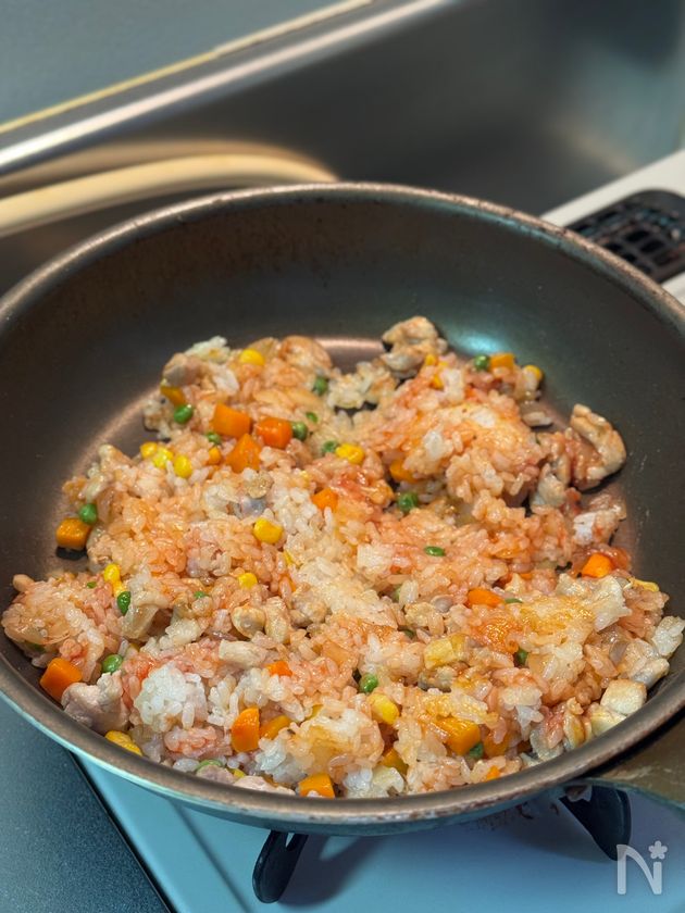(2) まずは【ケチャップライス】作り。フライパンにサラダ油をひいて、鶏肉と玉ねぎとミックスベジタブルを中火で炒める。しんなりしてきたら白米を加えて【A】で味付けて皿へ移す。