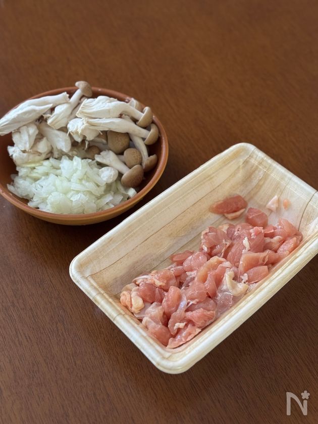 (1) 玉ねぎは微塵切りに、鶏肉(炊き込みご飯用)は大きければ1㎝程度に切る。しめじは石づきを切り落としてほぐしておく。
