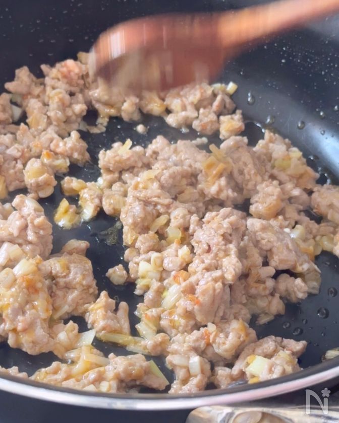 (4) 豚ひき肉を入れ、肉に火が通るまで中火で炒める。
