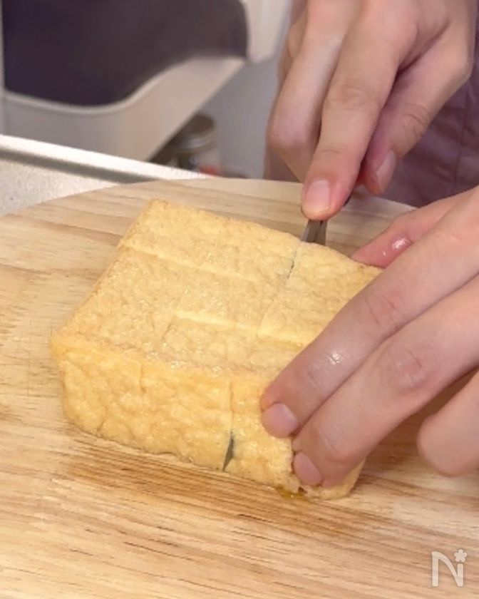 (2) 厚揚げを9等分に切る。
