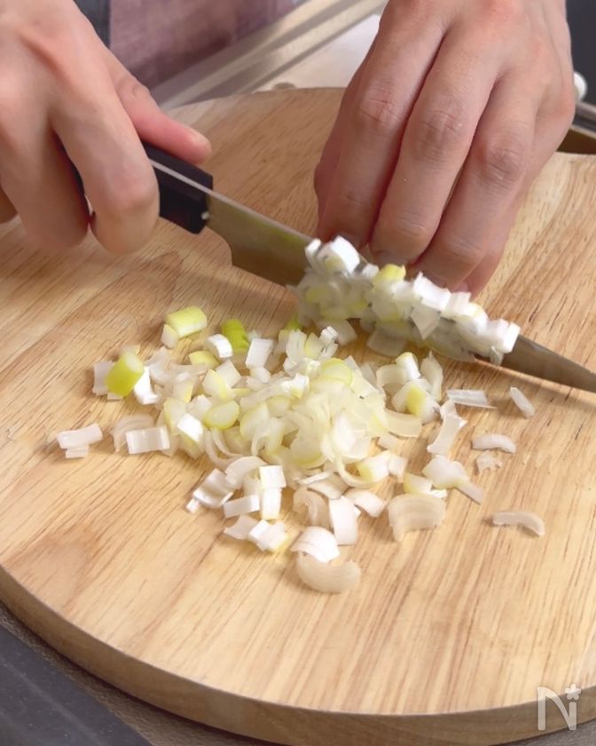 (1) 長ねぎをみじん切りにする。