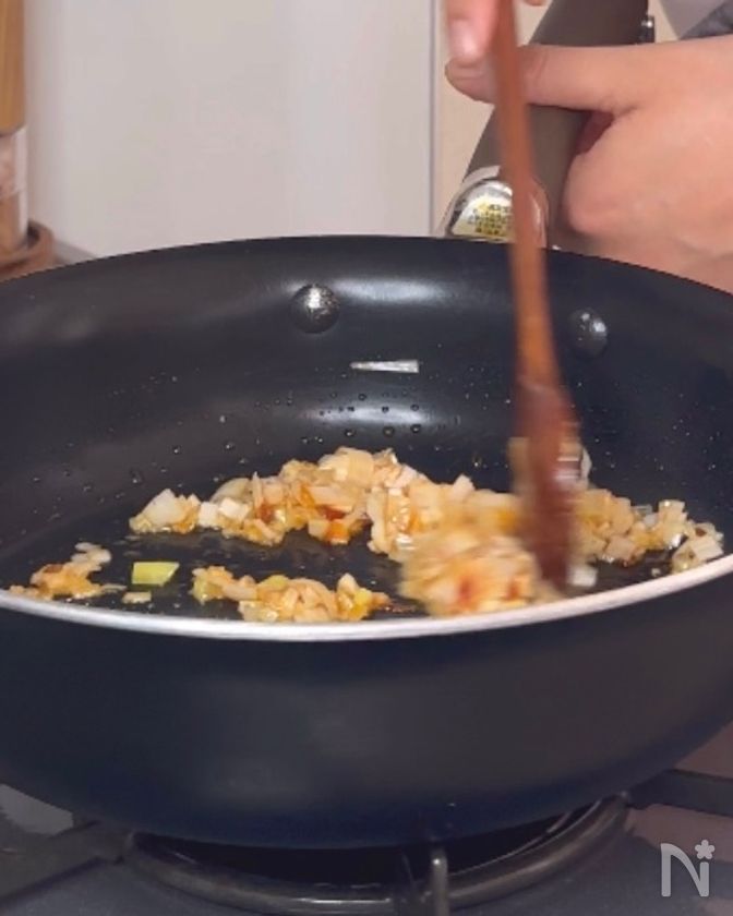 (3) 冷たいフライパンに長ねぎ、【A】を入れて弱火で炒める。