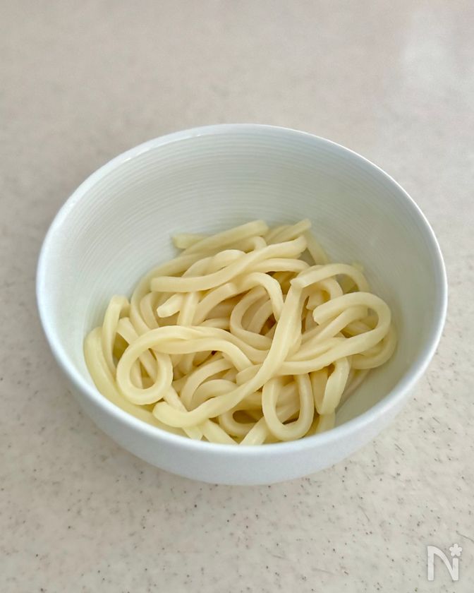 (5) 冷凍うどんは表記通りに解凍し、器に盛る。
