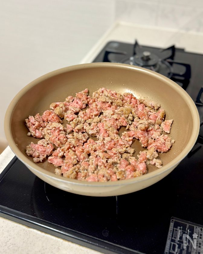 (2) 鍋を中火にかけてごま油をひき、豚ひき肉を炒める。