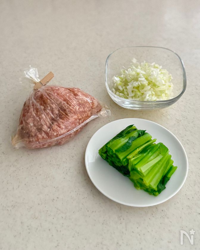 (1) 豚ひき肉は【A】とともにポリ袋に入れて、よく揉み込み、30分ほどおく。長ネギはみじん切りにする。小松菜はさっと茹でて、4cmのざく切りにする。