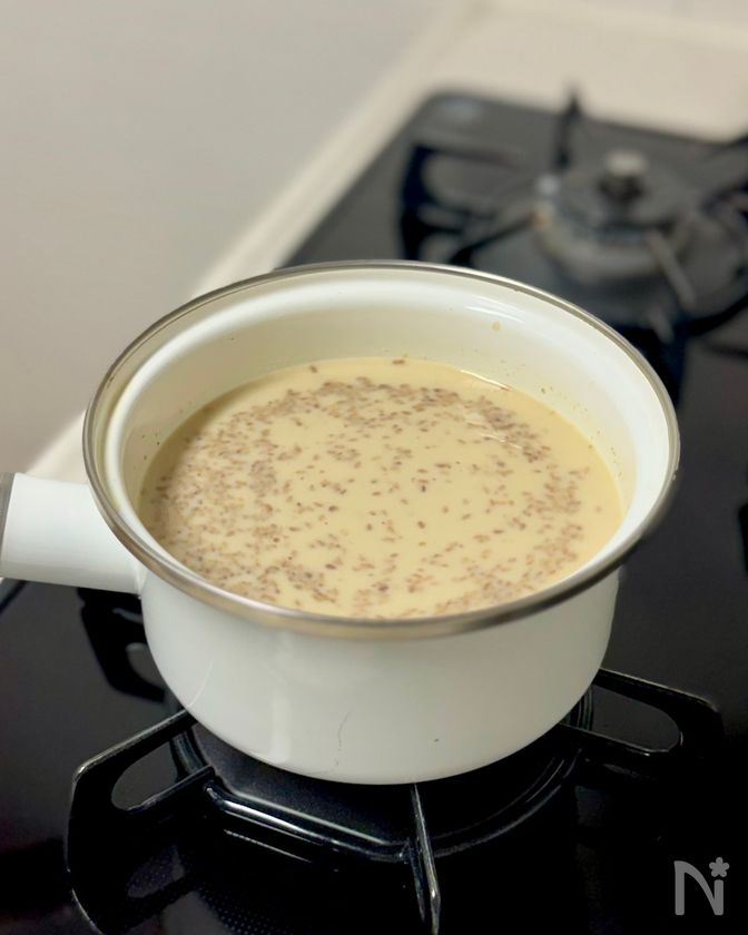 (4) 小鍋に【B】を入れて中火にかけ、煮立ってきたら無調整豆乳を加える。沸騰させないよう、ふつふつ手前で温めたら火を止める。