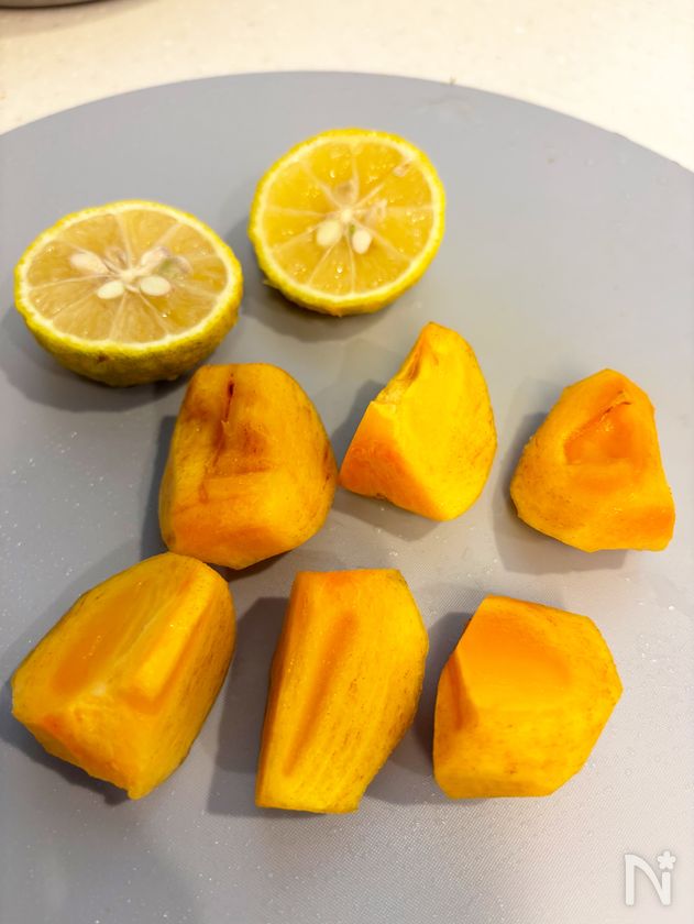(1) 柿は皮を剥き6等分のくし切りにする。あれば種も除く。