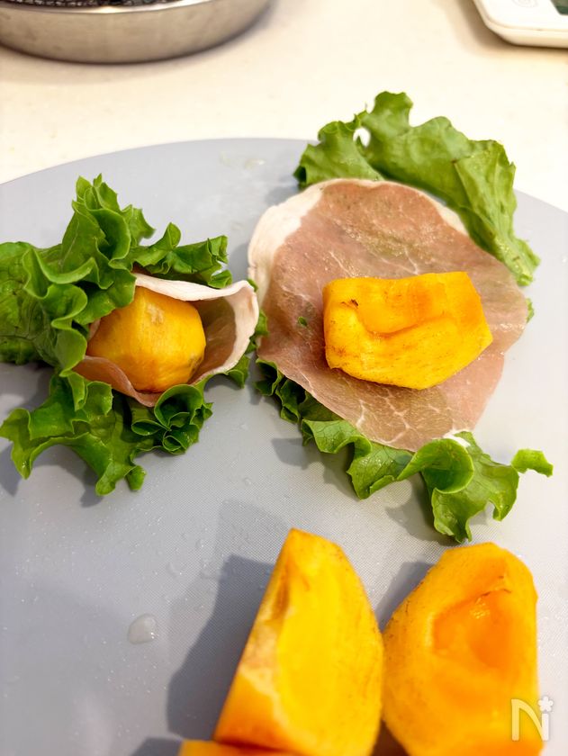 (3) グリーンリーフに生ハムを乗せ、その上に柿を乗せクルっと巻く。