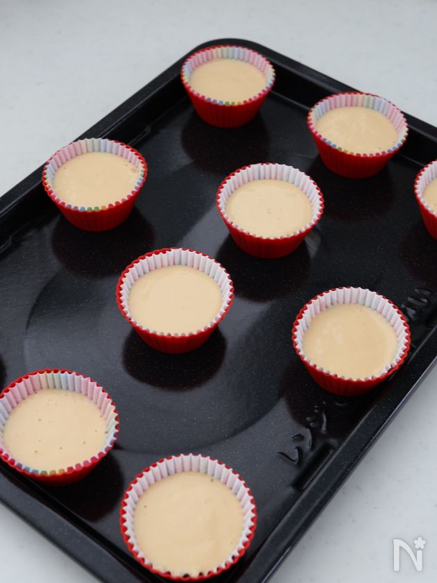 (4) マフィンカップに生地を型八分目くらいまで流し入れる。