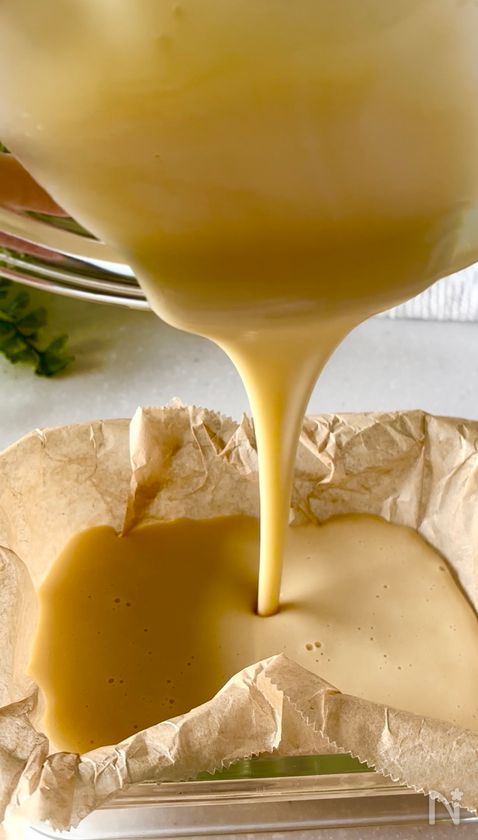 (3) 耐熱容器にクッキングシートをしき、生地を流し入れる。