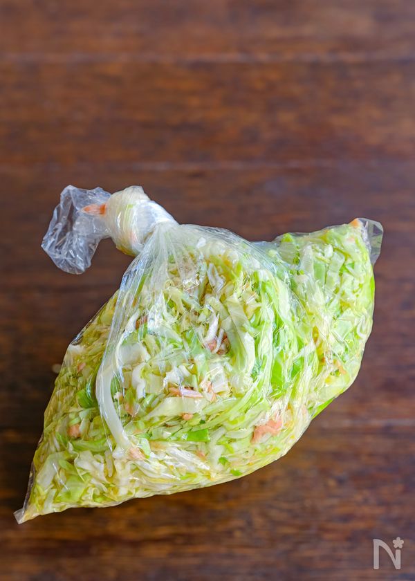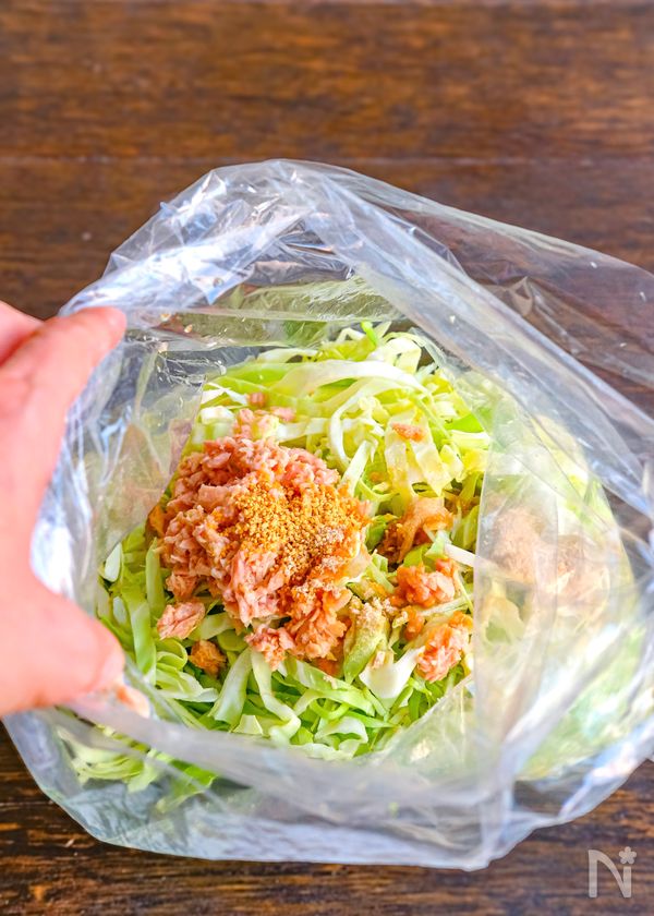 (1) きゃべつは細切りにしてポリ袋に入れ、【A】とツナ缶(オイル漬け)、ツナ缶のオイルも全部加えてよく揉み混ぜる。