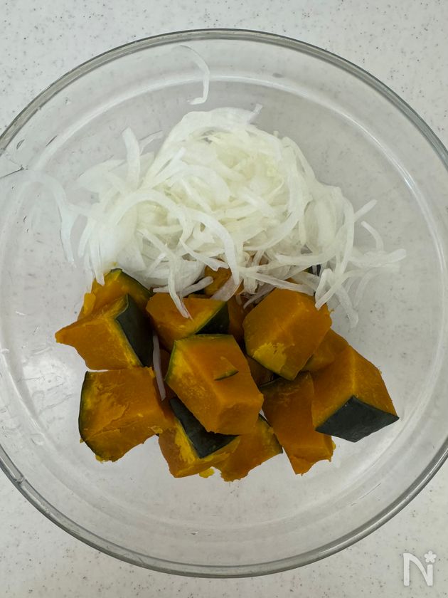 (2) かぼちゃ、玉ねぎ、ツナ缶(水煮)を【A】で和える。塩昆布が馴染むまで、3分程置く。