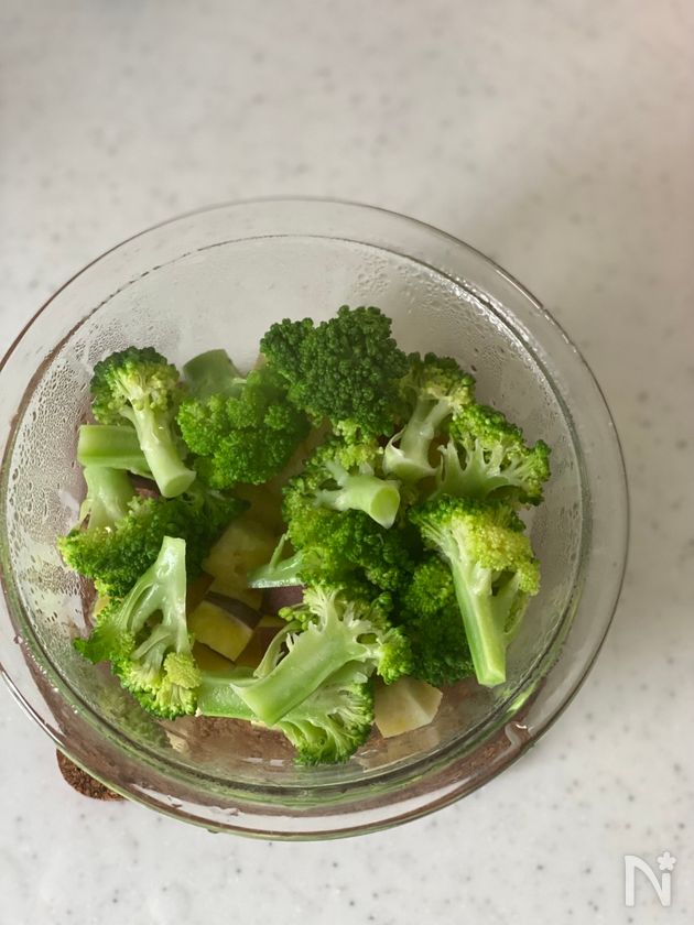 (3) 2にブロッコリーをのせて再度ふんわりとラップをし、さらに2分20秒加熱する。