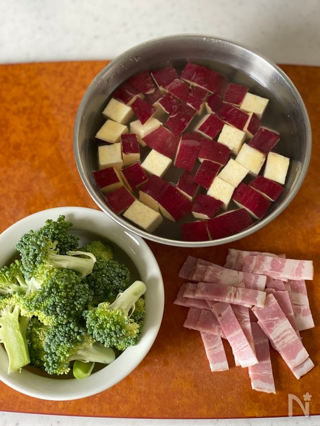 (1) ベーコンは短冊切りにする。さつまいもはよく洗い、皮付きのまま約2cm角に切り水にさらす。ブロッコリーは小房に分ける。