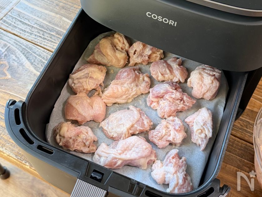 (3) COSORI TurboBlaze™ 6.0L ノンフライヤーを200℃に予熱する。バスケットにクッキングシートを敷き、2の鶏もも肉を並べたら「ノンフライモード」で20分程度焼く。途中で上下を裏返す。