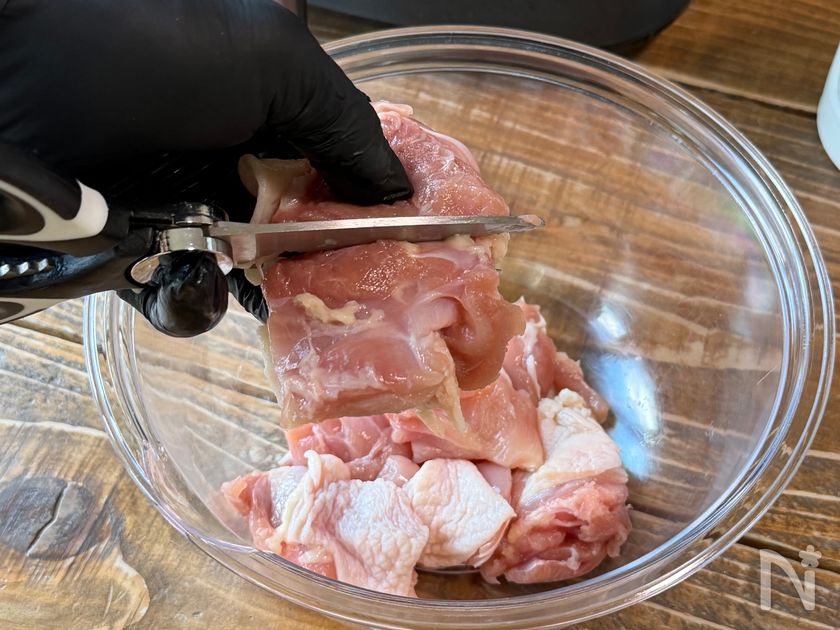 (1) 鶏もも肉をひと口大に切ってボウルに入れ、塩、こしょうで下味をつける。