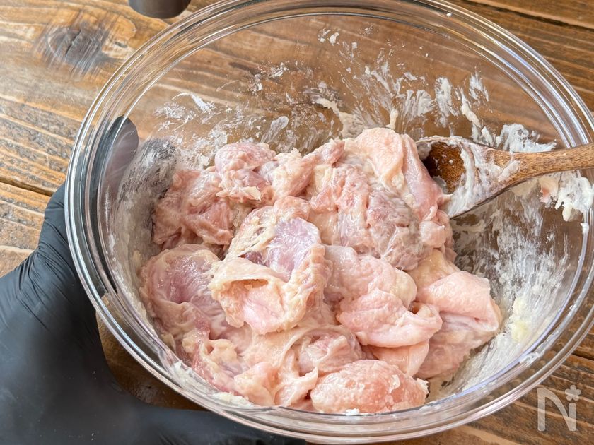 (5) 鶏もも肉が焼き上がったら【B】のボウルに移しよく絡める。