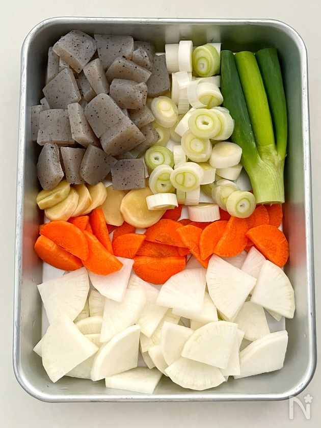 (2) 鍋に出し汁と、長ネギの青い部分、しょうが、豚もつ、大根、にんじん、こんにゃくを入れ、弱めの中火で10分煮込む。