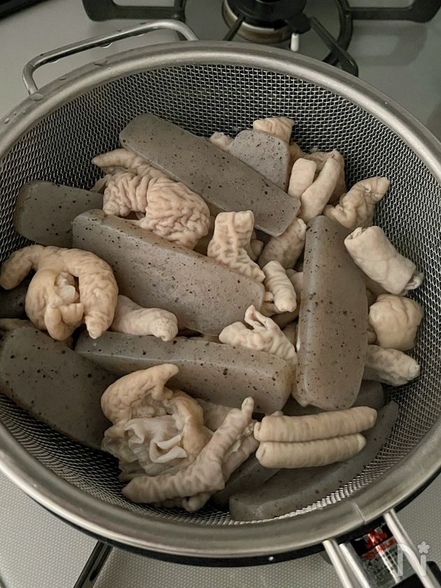 (下準備) こんにゃくは1cm幅に切り、豚もつと共に、5分下ゆでし、ザルにあげ、湯を切っておく。