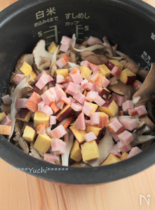 (2) 米の上に、舞茸+しめじ+しいたけ、にんじん、さつまいも、ベーコン、の順に広げのせ、炊飯器の普通モードで炊く。