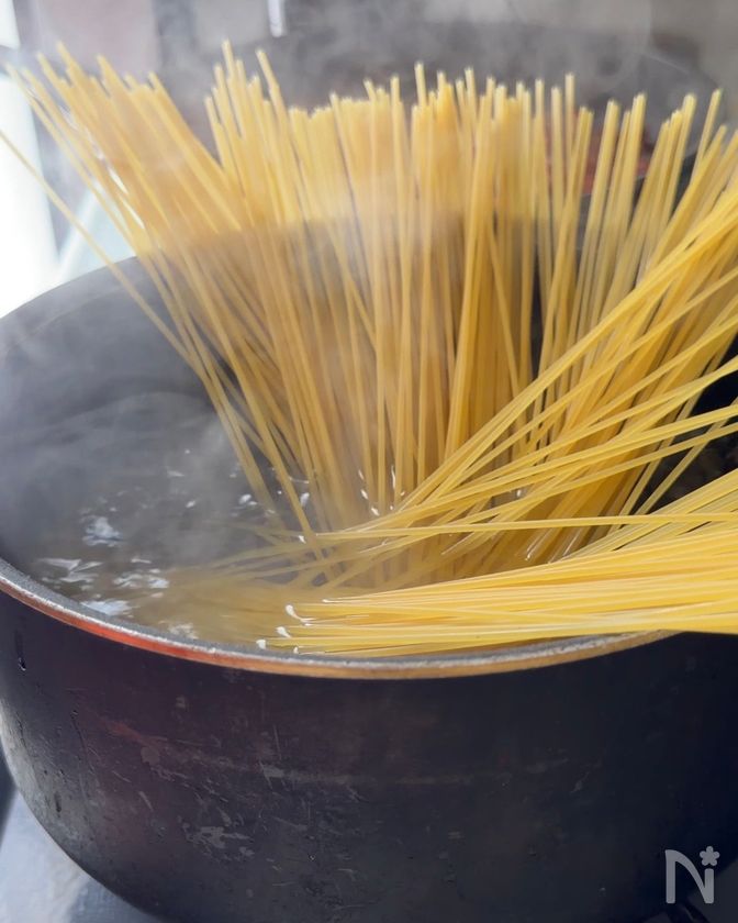 (4) 鍋にたっぷりの湯を沸かして塩(分量外・小さじ1)を入れて、スパゲティを表示より1分半ほど短めに茹でる。