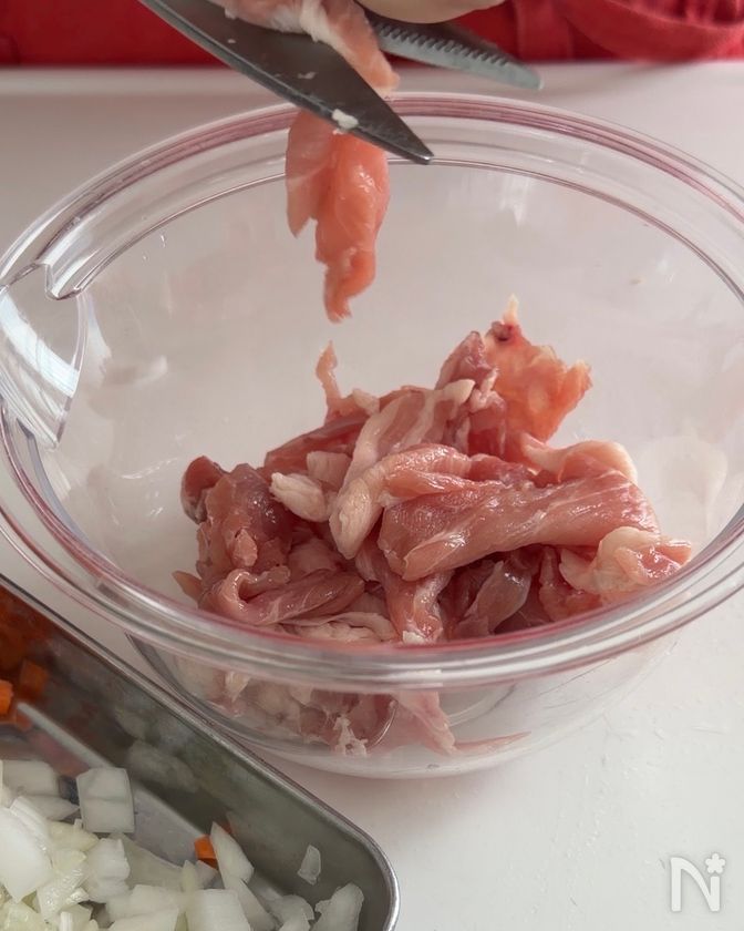 (1) 豚こま肉はキッチンバサミで細かく切る。にんじん、玉ねぎはみじん切りにする。