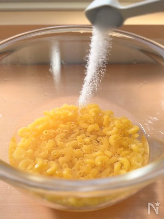 (1) マカロニは深い耐熱容器に入れて、水400ml(分量外)と塩少々(分量外)を入れて、表記時間+4分レンチンする。加熱が終わったら、硬さをチェックして、ザルにあげ水切りして冷ましておく。