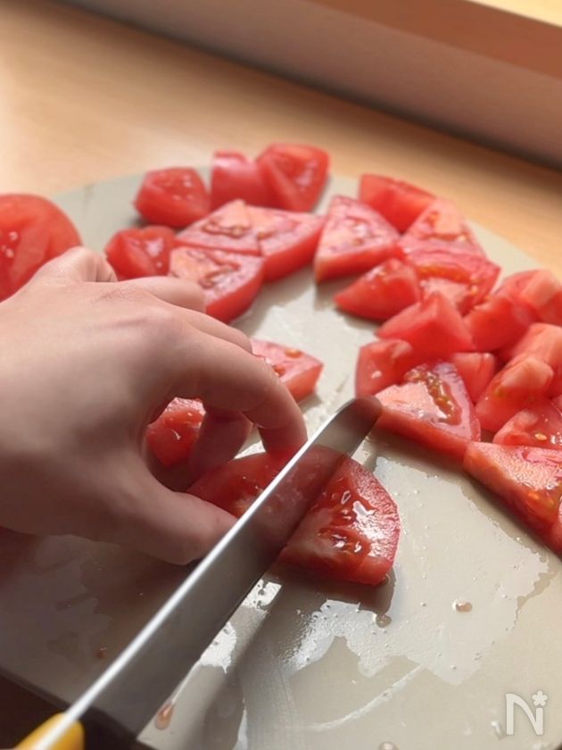 (2) トマトは一口大に切って塩を少々振り、キッチンペーパーで水気を取る。大葉は千切りにする。