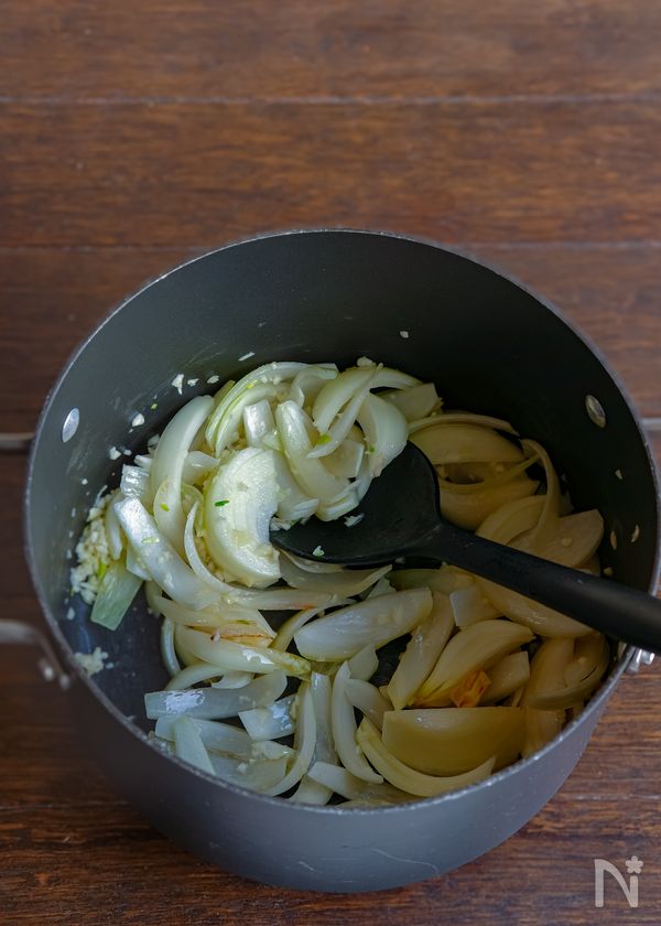 (2) 鍋にバターを熱して玉ねぎとにんにくみじん切りを炒める。