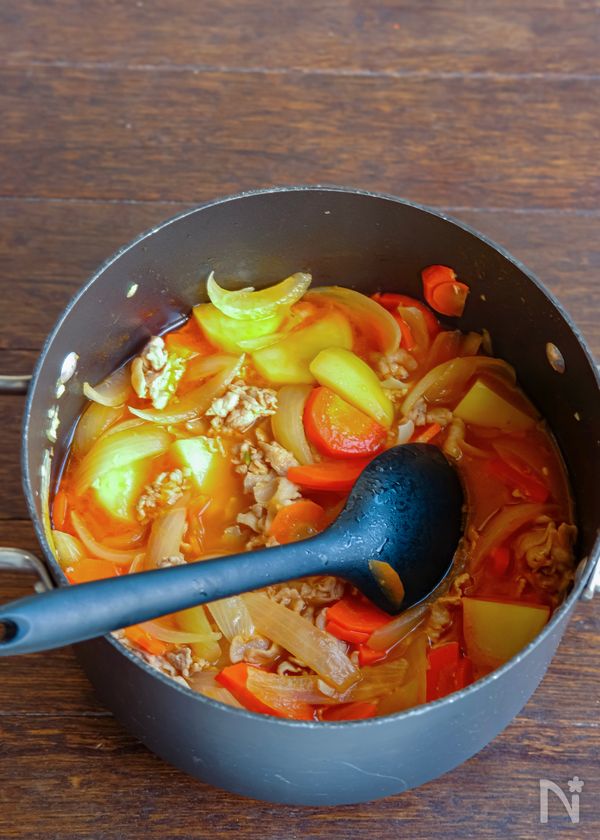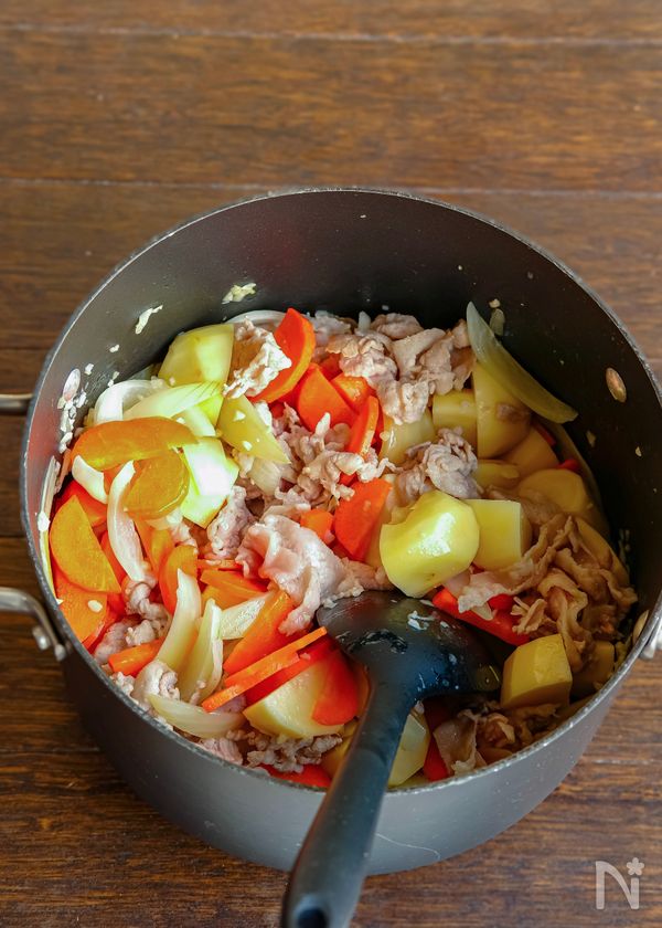 (4) 豚バラ肉に火が通って来たら、にんじん、じゃがいもを加えて炒め、油が回ったら、水を加えて煮る。