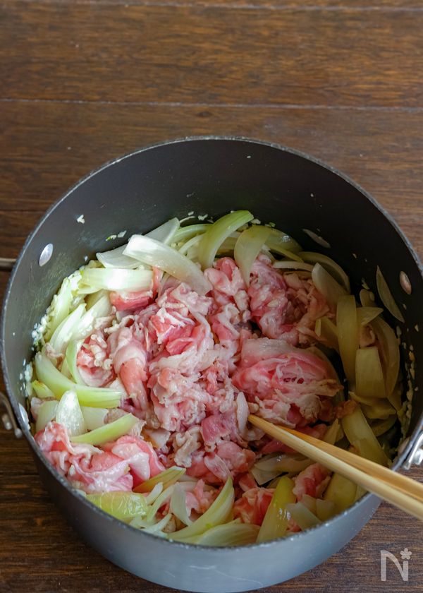(3) 玉ねぎがしんなりして来たら豚バラ薄切り肉を加えて炒める。