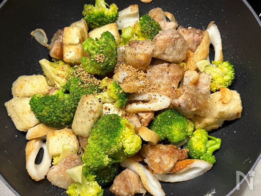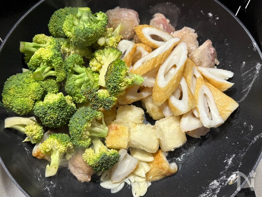 (3) 焼き目がついたら、ブロッコリー、ちくわ、ニンニク(薄切り)を加え炒める。