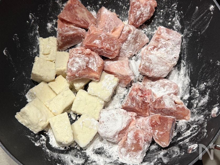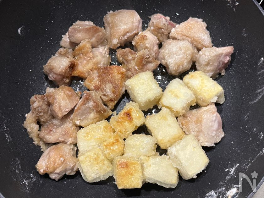 (1) フライパンに鶏もも肉と木綿豆腐を入れ、片栗粉をまぶす。
