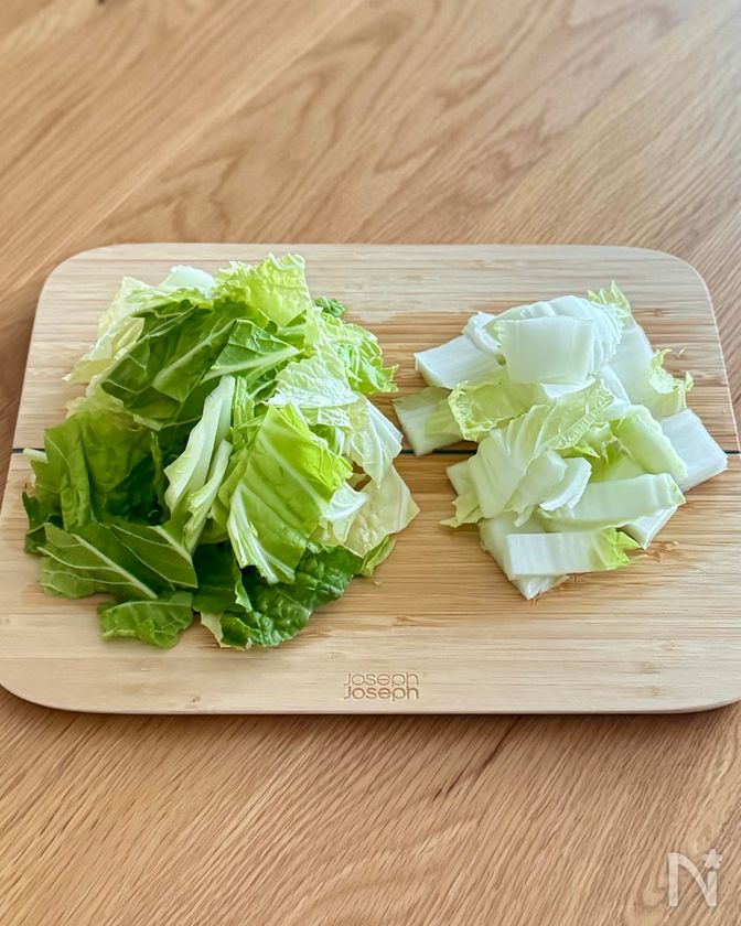 (2) 白菜はざく切りにし、芯の部分と葉の部分を分けておく。