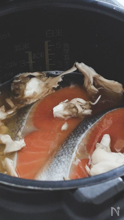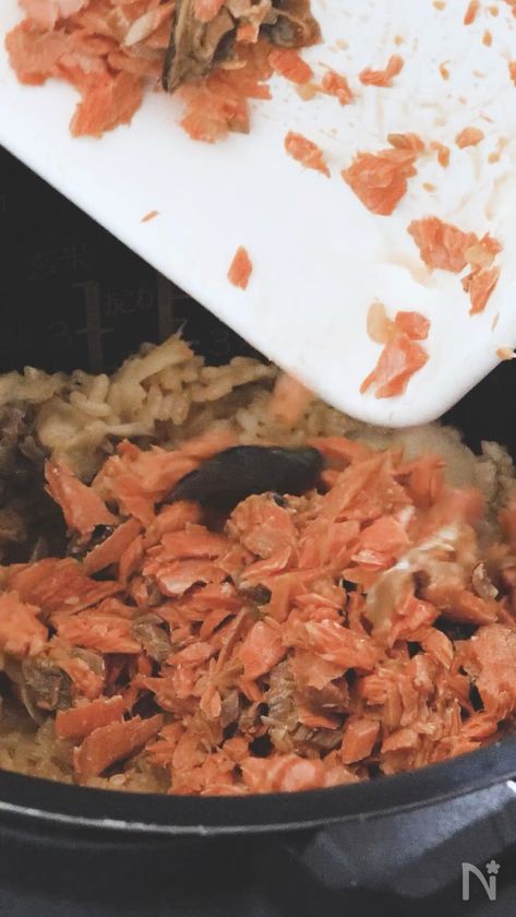 (2) 秋鮭、手でほぐした舞茸を加えて通常炊飯する。(早炊きでもOK)