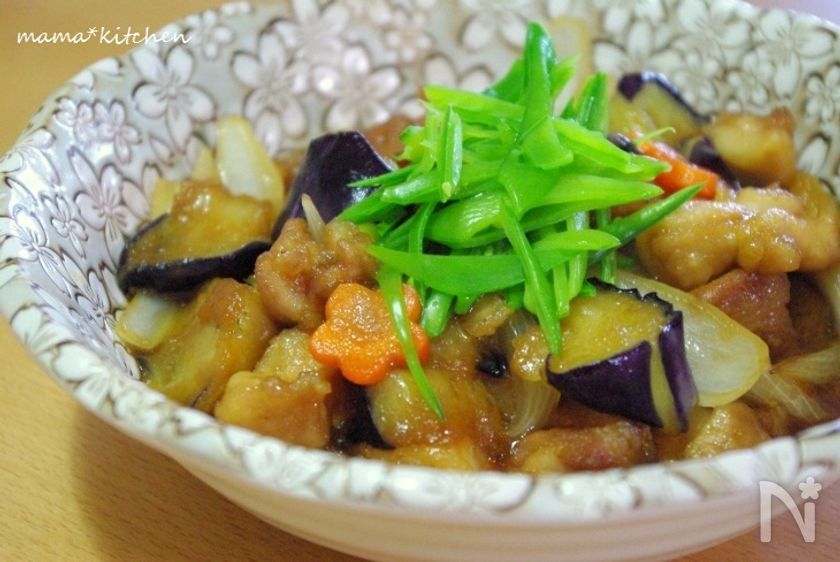 (3) フライパンに、【A】材料を合わせて玉葱と人参を加えて、火にかけます。人参などがやわらかくなったら、2の揚げた鶏もも・茄子を加えて煮汁がなくなりそうになるまで煮ます。