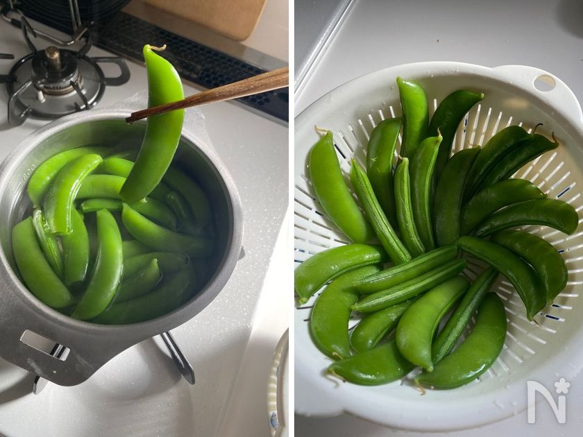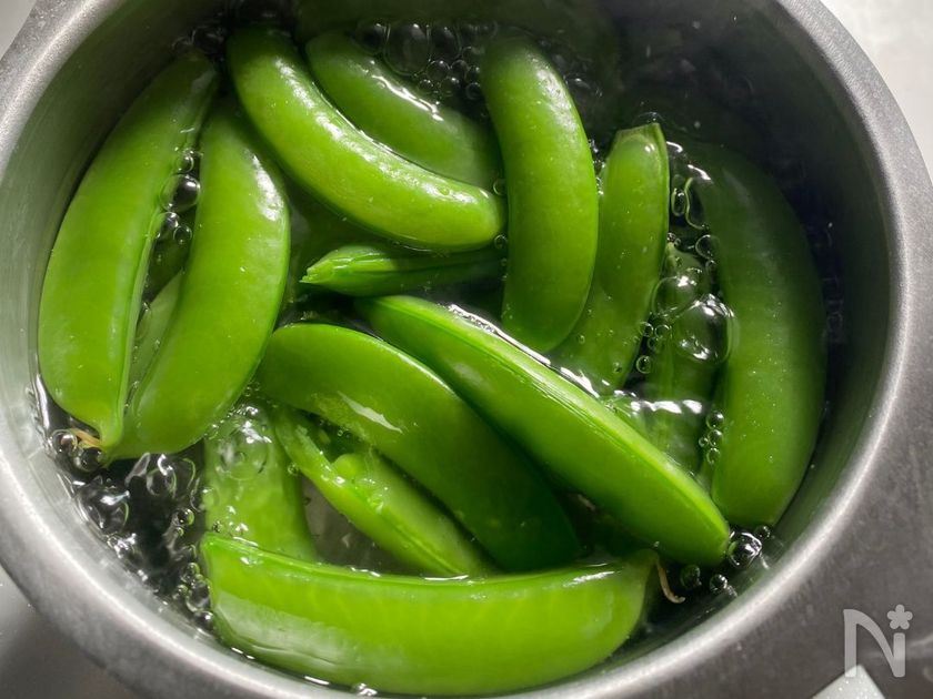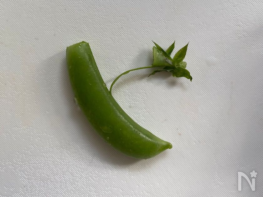 ・スナップえんどうは片側の筋だけ取って調理しました。両方の筋を取ると開きやすくなり、サラダなどに入れる場合は見た目も可愛く仕上がります。