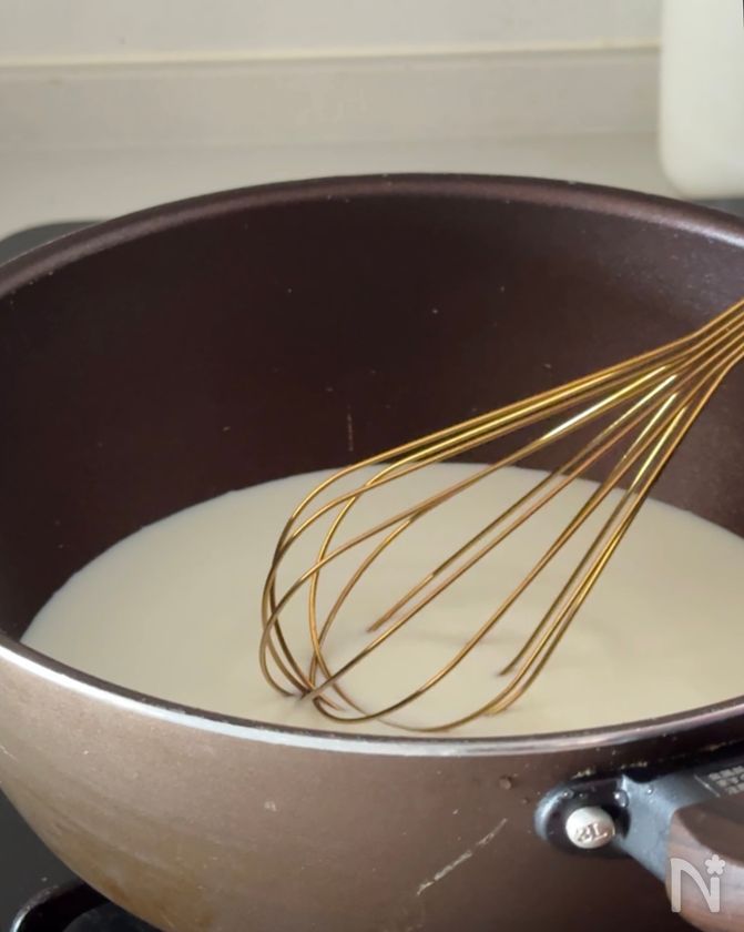 (3) 鍋に【A】を入れ泡立て器で混ぜながら、中火で加熱する。沸々としたら1分間ほどかき混ぜて火を止める。