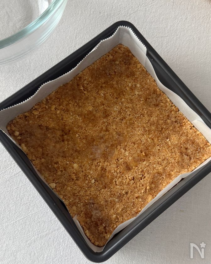 (1) 保存袋にクッキー(市販)を入れてめん棒で細かく砕き、溶かしバターを加えて揉み込んだら、型に敷き詰める。