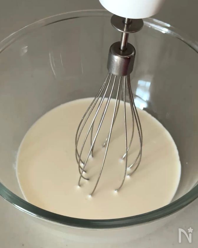 (2) 生クリームは9分立てを目安にしっかりと泡立てる。