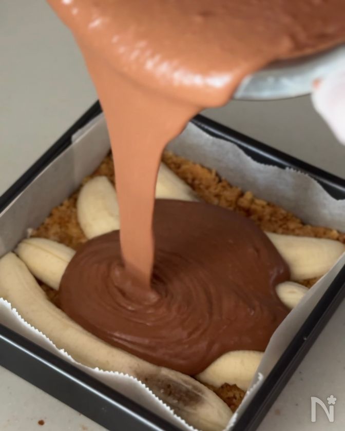 (7) 縦半分に切ったバナナを型に並べて、生地を流し入れる。冷蔵庫で1時間ほど冷やす。
