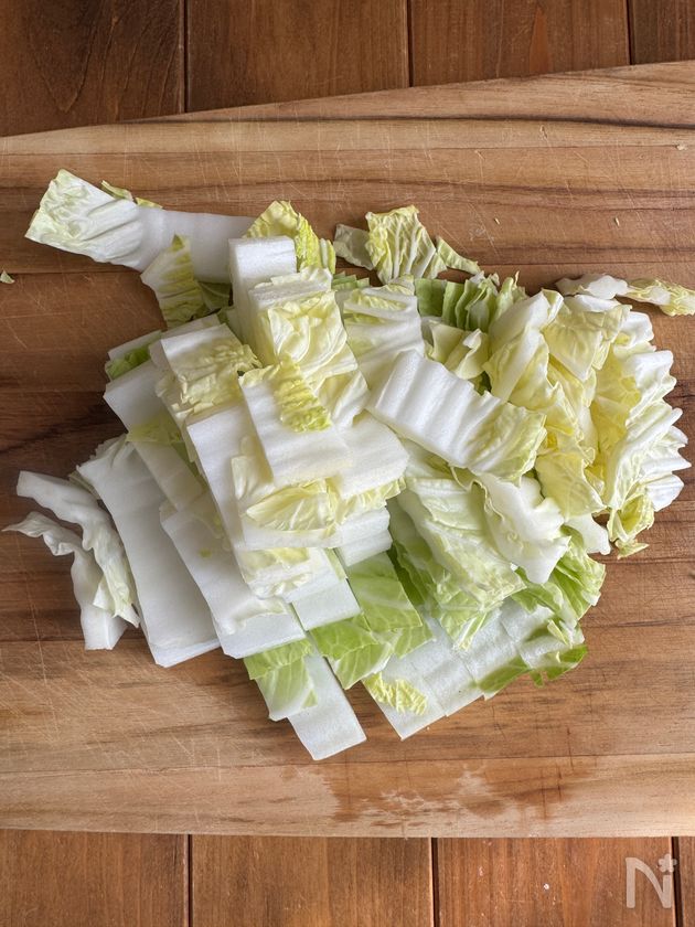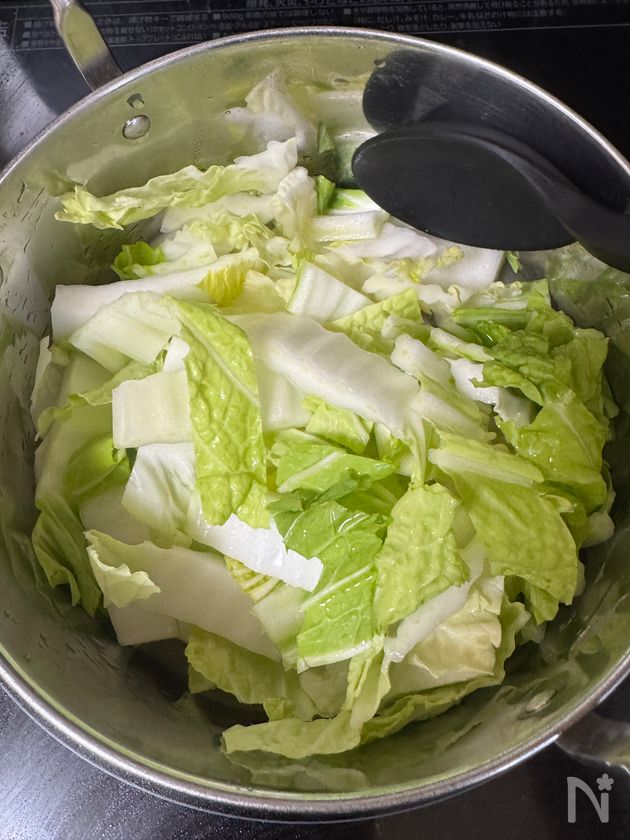 (2) フライパンにごま油をひき中火にかけたら白菜を入れ炒める。