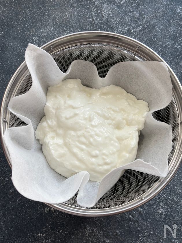 (下準備) ボウルにザルを重ねてキッチンペーパーを敷く。プレーンヨーグルトを入れて上からもキッチンペーパーをヨーグルトにピッタリ付くようにかぶせる。冷蔵庫に入れて一晩水切りする。
