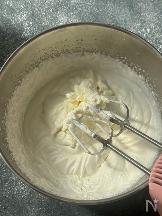 (1) ボウルに生クリームと砂糖を入れてハンドミキサーでツノが立つ程度まで泡立てる。