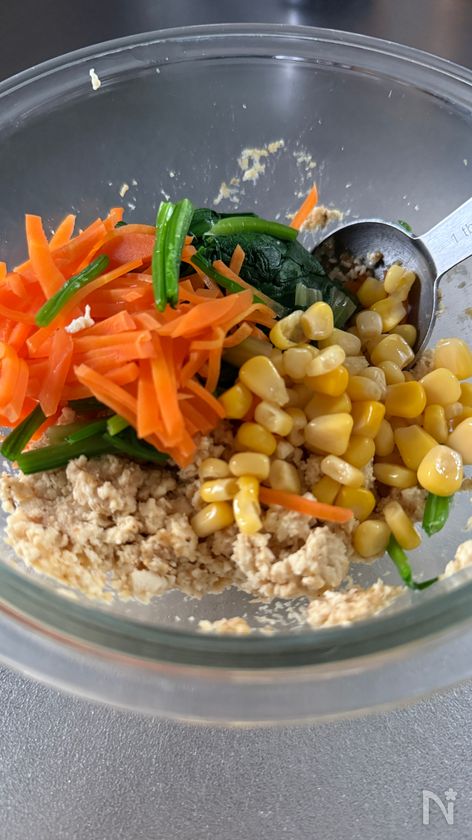 (4) ほうれん草、にんじん、スイートコーンを加えて混ぜ合わせる。