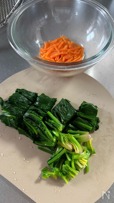 ほうれん草はゆでて冷水にとり、水気をよく切って2〜3cm幅に切る。
