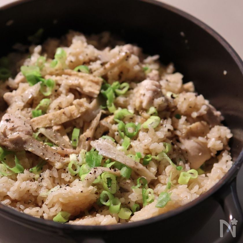 (6) 炊飯が終わったら、しゃもじで全体を切るように混ぜてお好みで細ねぎを散らす。